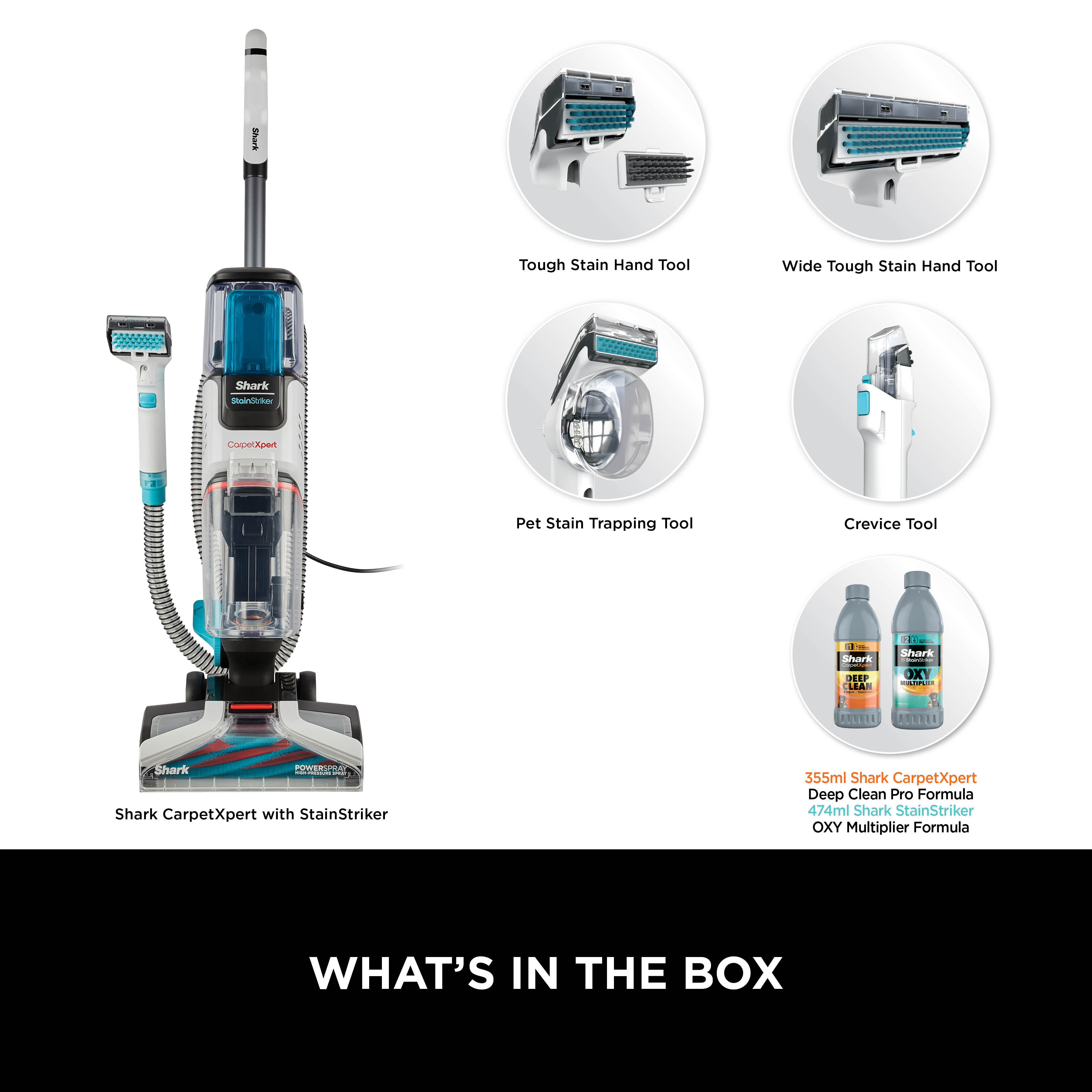 - Includes Tough Stain Hand Tool, Wide Tough Stain Tool, Pet Stain Trapping Tool, Crevice Tool and Shark CarpetXpert & StainStriker formula starter bottles