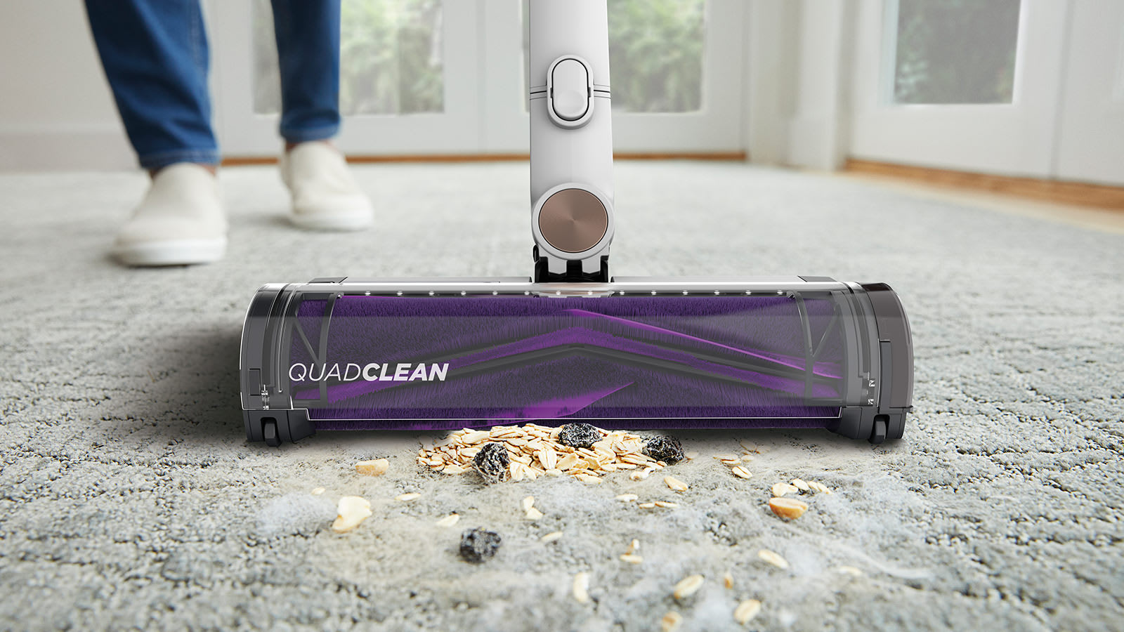 - Deep cleans carpets & hard floors with QuadClean floorhead with Anti Hair Wrap