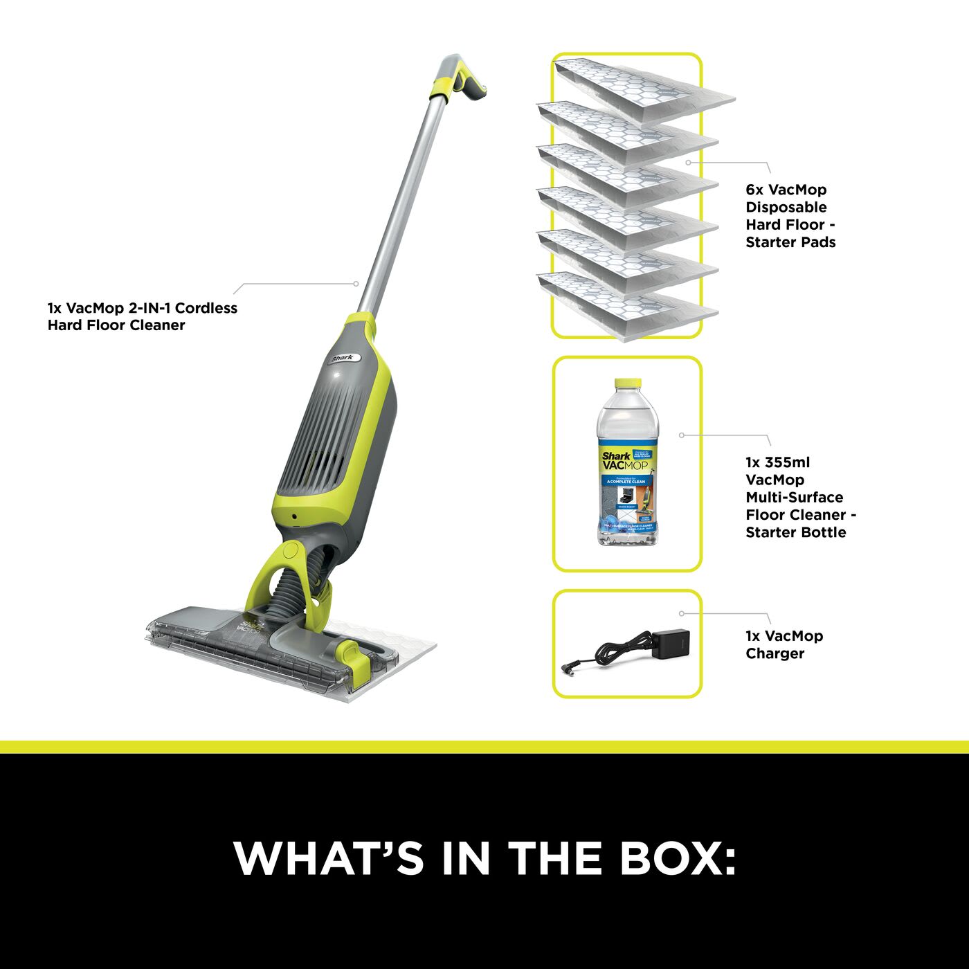 Includes: VacMop unit x6 VacMop disposable starter pads x1 350ml Multi-Surface Cleaning Solution starter bottle x1 VacMop Charger